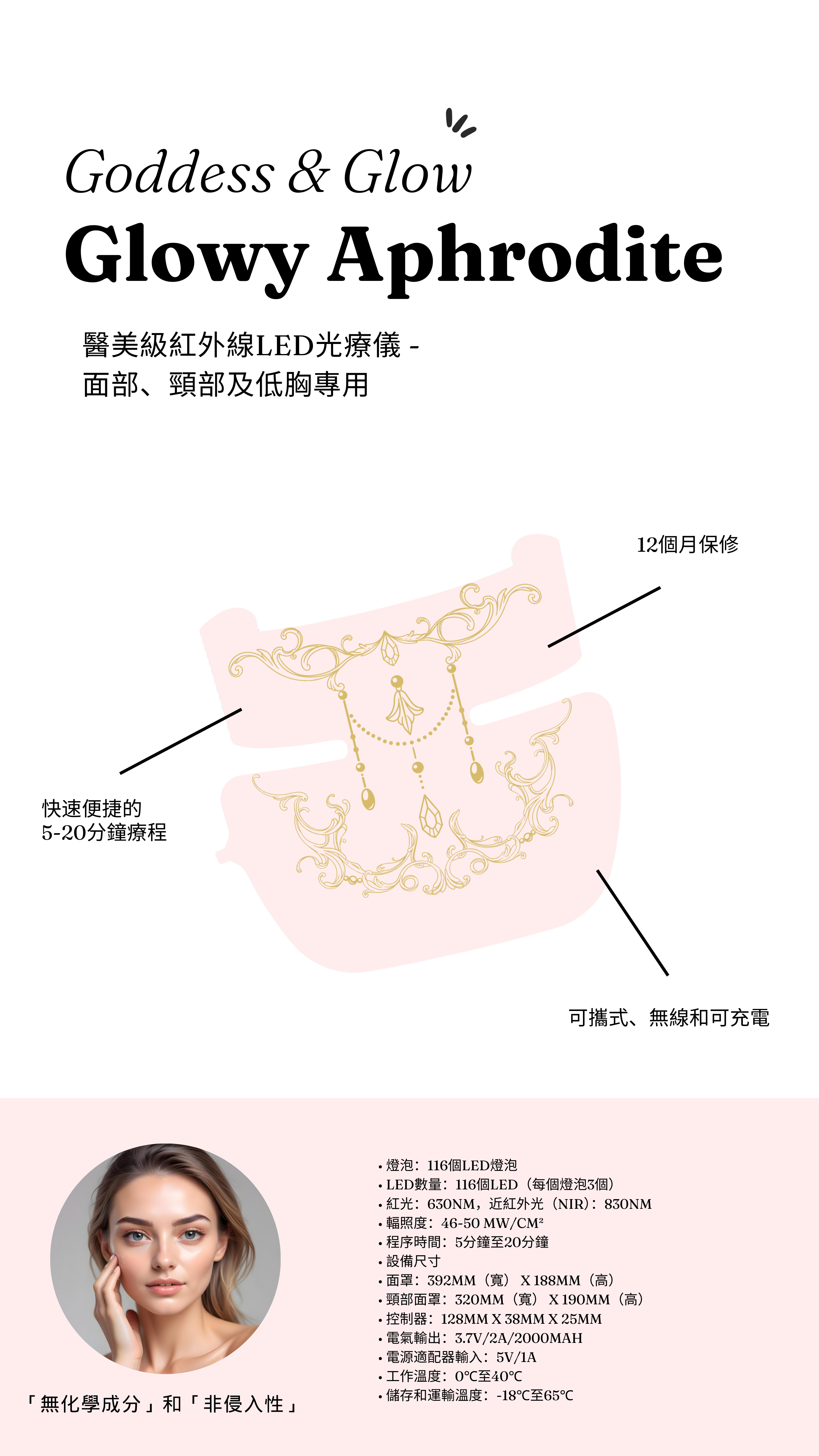 這款紅外線LED光療儀是來自紐西蘭🇳🇿的一款醫美級產品,專門為提升肌膚光澤和緊緻度而設計。採用高科技的紅外線技術,能夠有效改善膚質,美白淡斑,刺激膠原蛋白生成,減少皺紋,並讓肌膚重拾年輕光彩。專為面部、眼部周圍、頸部及低胸區域而定制,為使用者提供非侵入性且無痛的美容體驗。充電式-無線束縛,隨時隨地去到邊用到邊,車上用,上班用,做家務用,玩手機用,睇Netflix用……只需日日5分鐘,皮膚有效改善10大問題。