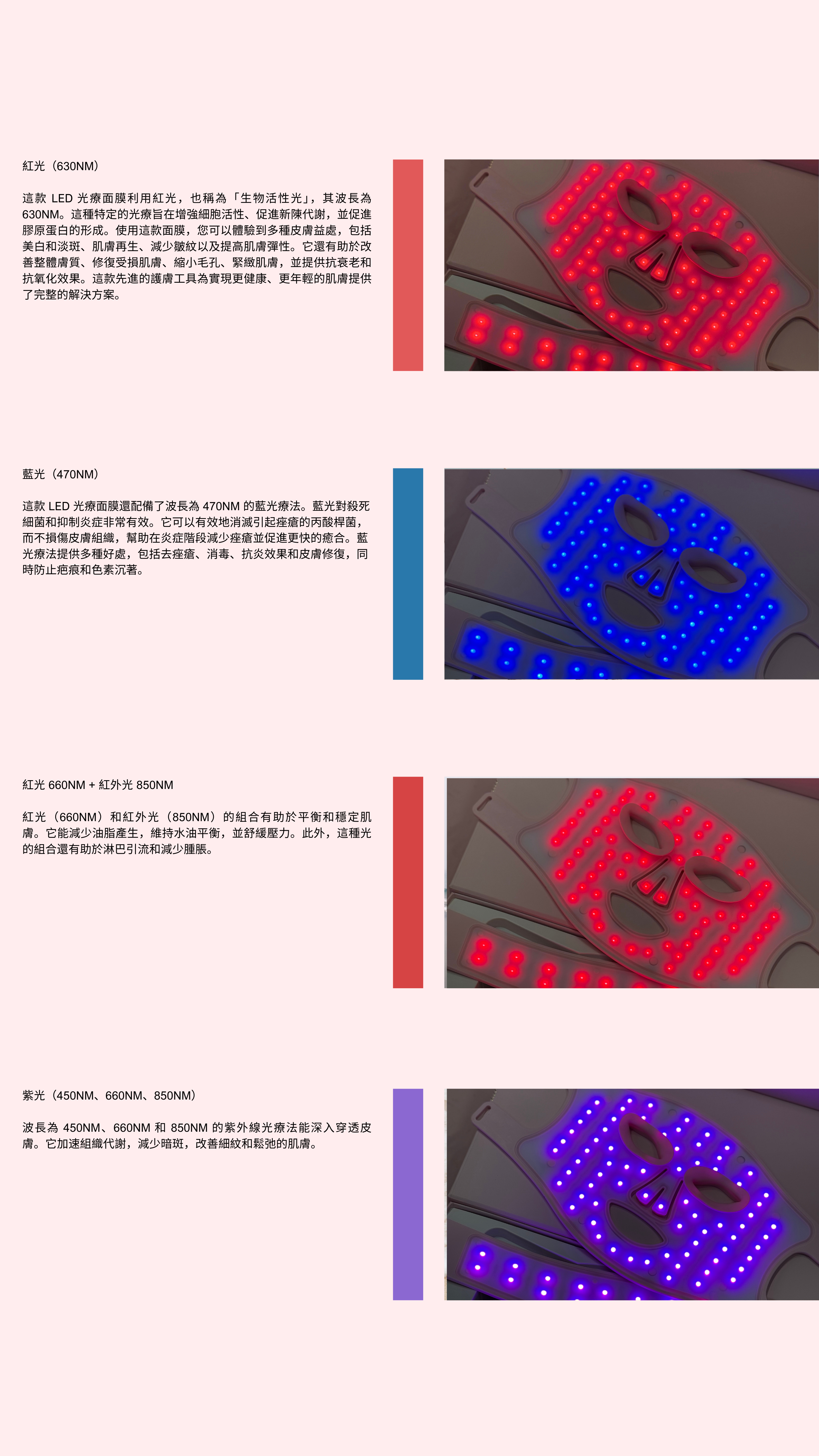 - 紫光(450nm + 660nm + 850nm):減少暗斑、改善細紋