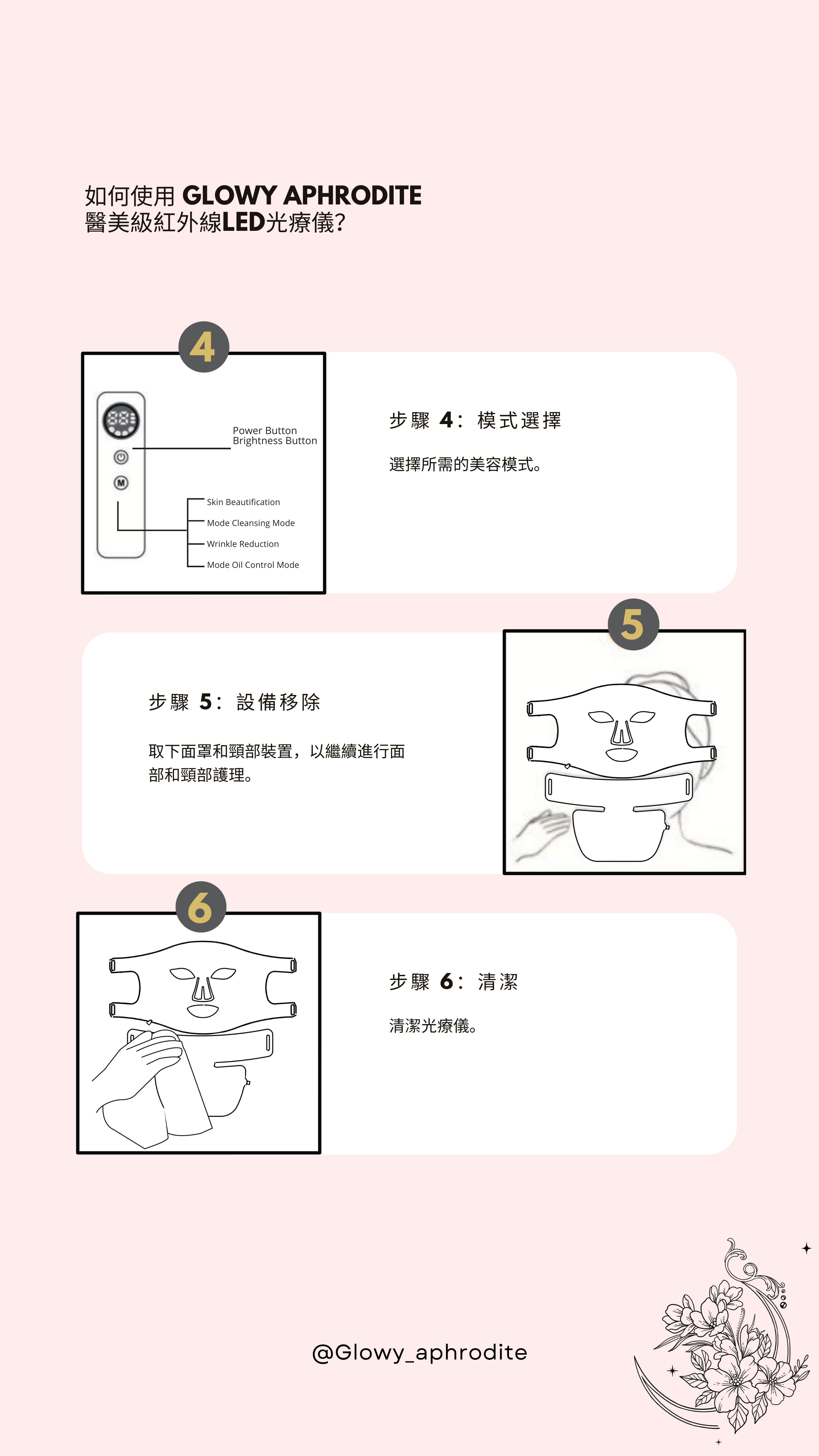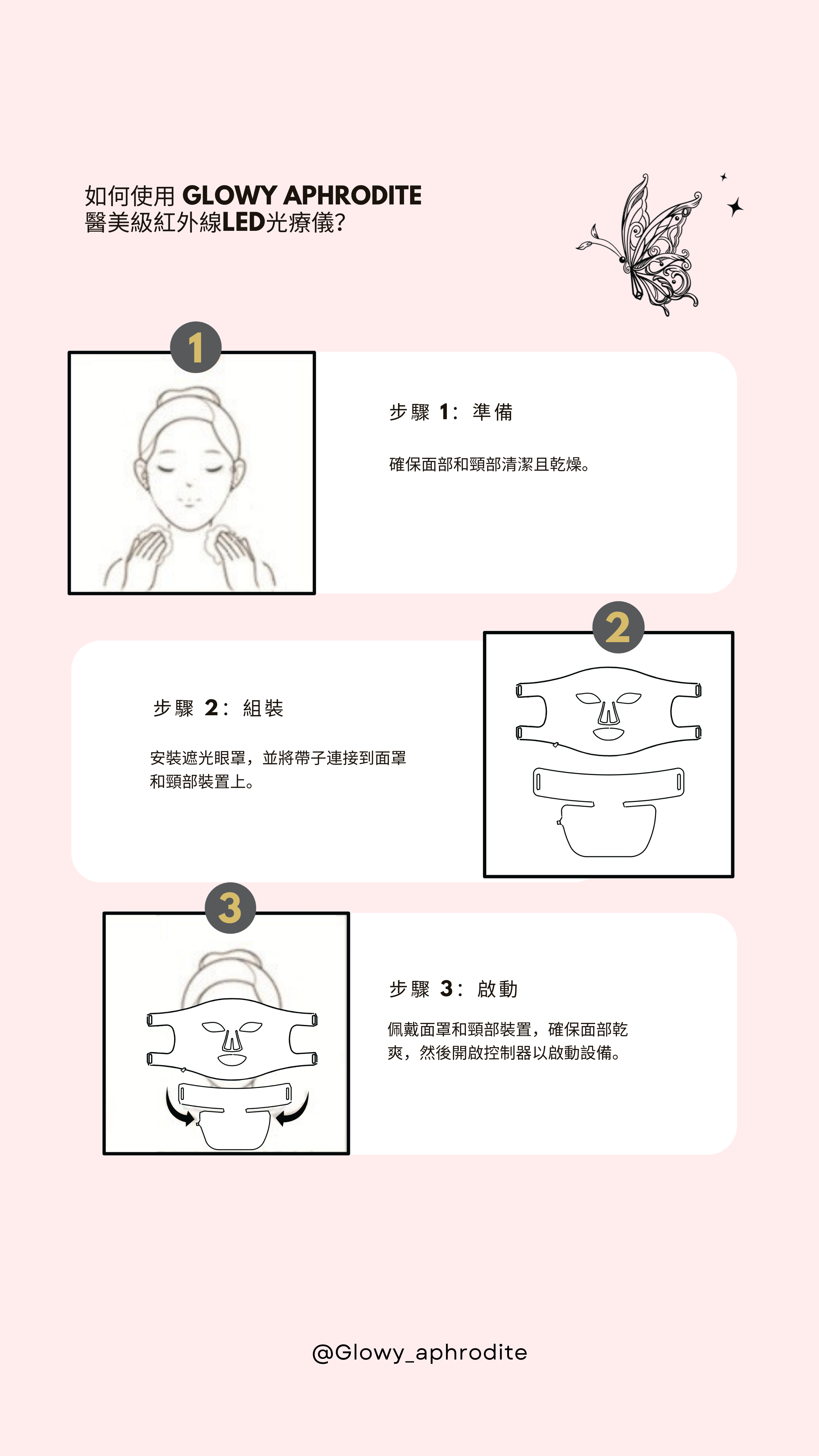 先用洗面泡潔面,之後照燈5至20分鐘, 最後敷上面膜