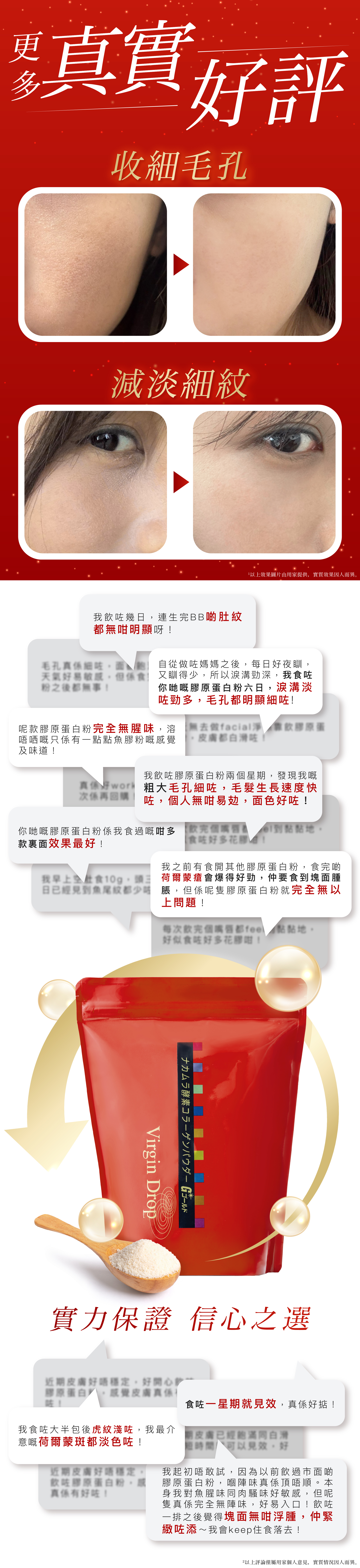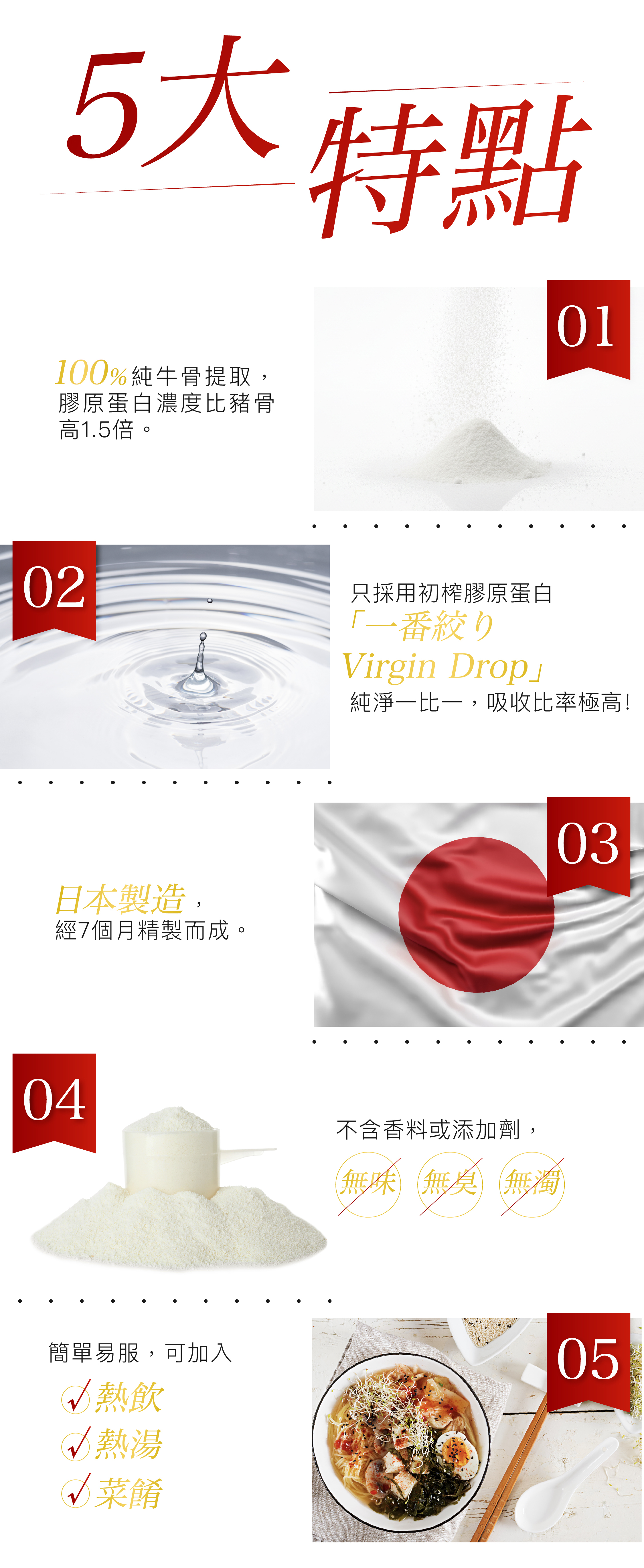 「日本最強」原料取自牛骨,膠原蛋白bloom 300,濃度是豬骨的1.5倍。Virgin Drops 無味無臭,不添加任何調味料或甜味劑。