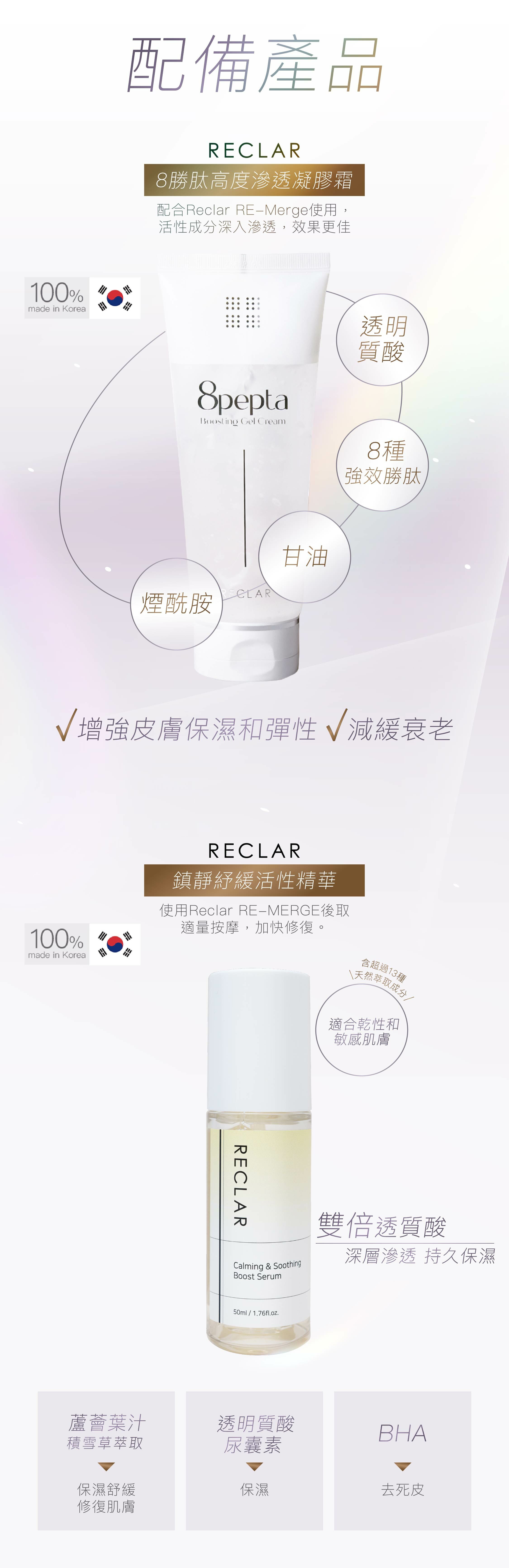 使用方法 :每次使用Reclar RE-Merge後,取適量塗抹於臉部,輕輕按摩至完全吸收,加快肌膚修復。