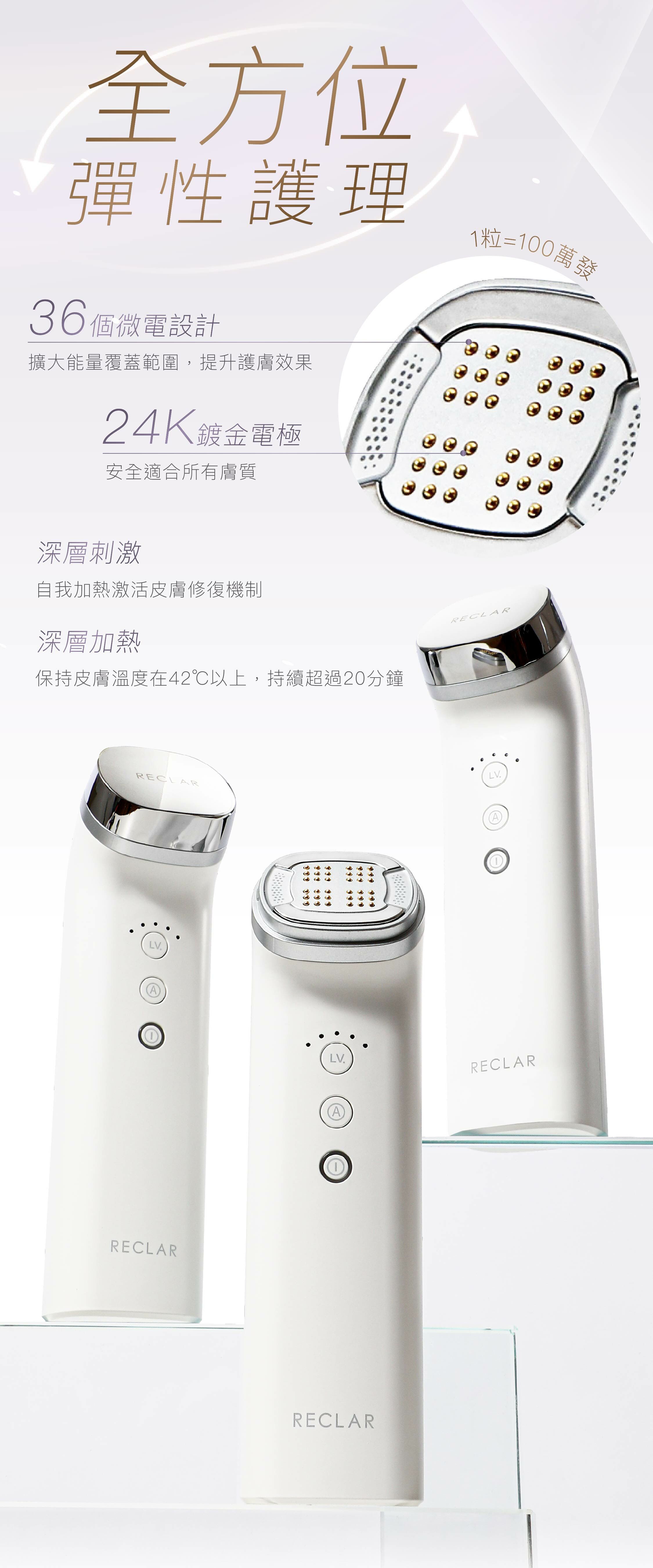 透過36個24K鍍金電極產生100萬發高頻能量,提供深層熱刺激,保持皮膚溫度在42℃以上,持續超過特定時間,促進膠原蛋白生成。