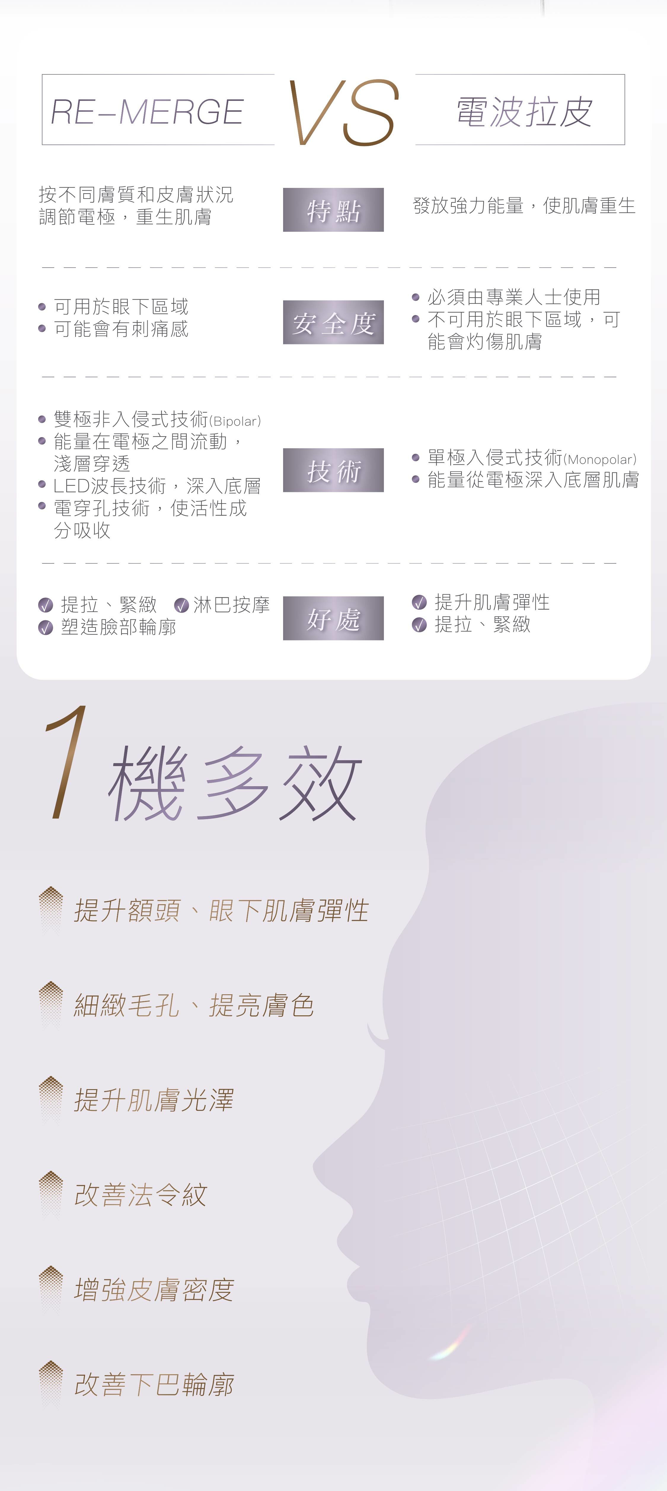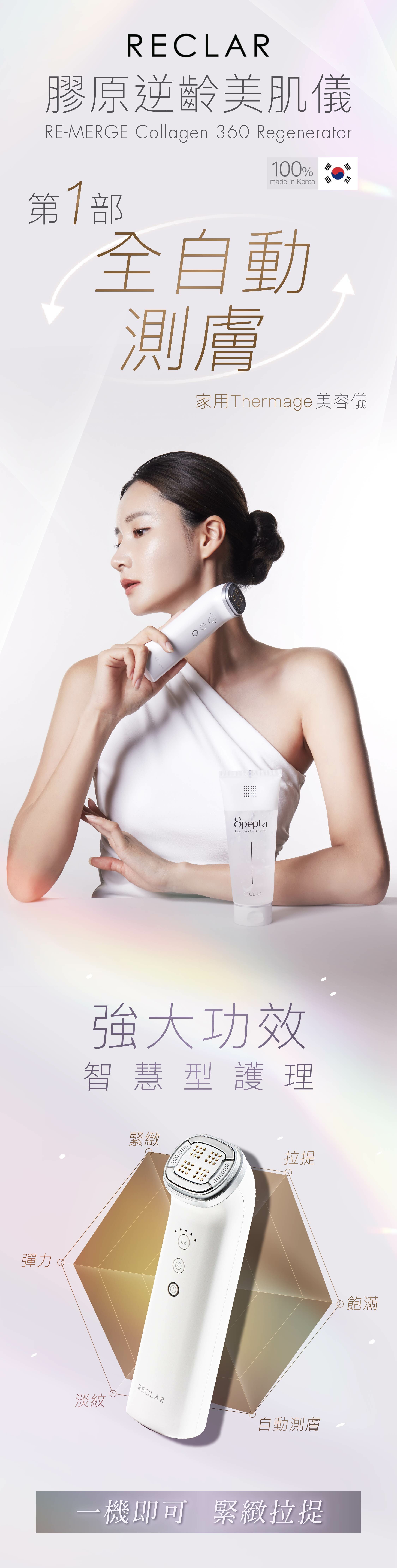 來自韓國🇰🇷頂尖美容科技,Reclar RE-MERGE結合先進的高射頻技術與多種LED光療功能,專為改善皮膚問題(如皺紋、粗大毛孔等)而設計。其獨特的3種射頻能量與高科技LED燈光深入皮膚層,激活真皮層細胞自我再生,幫助重建健康的肌膚結構,實現逆齡效果。