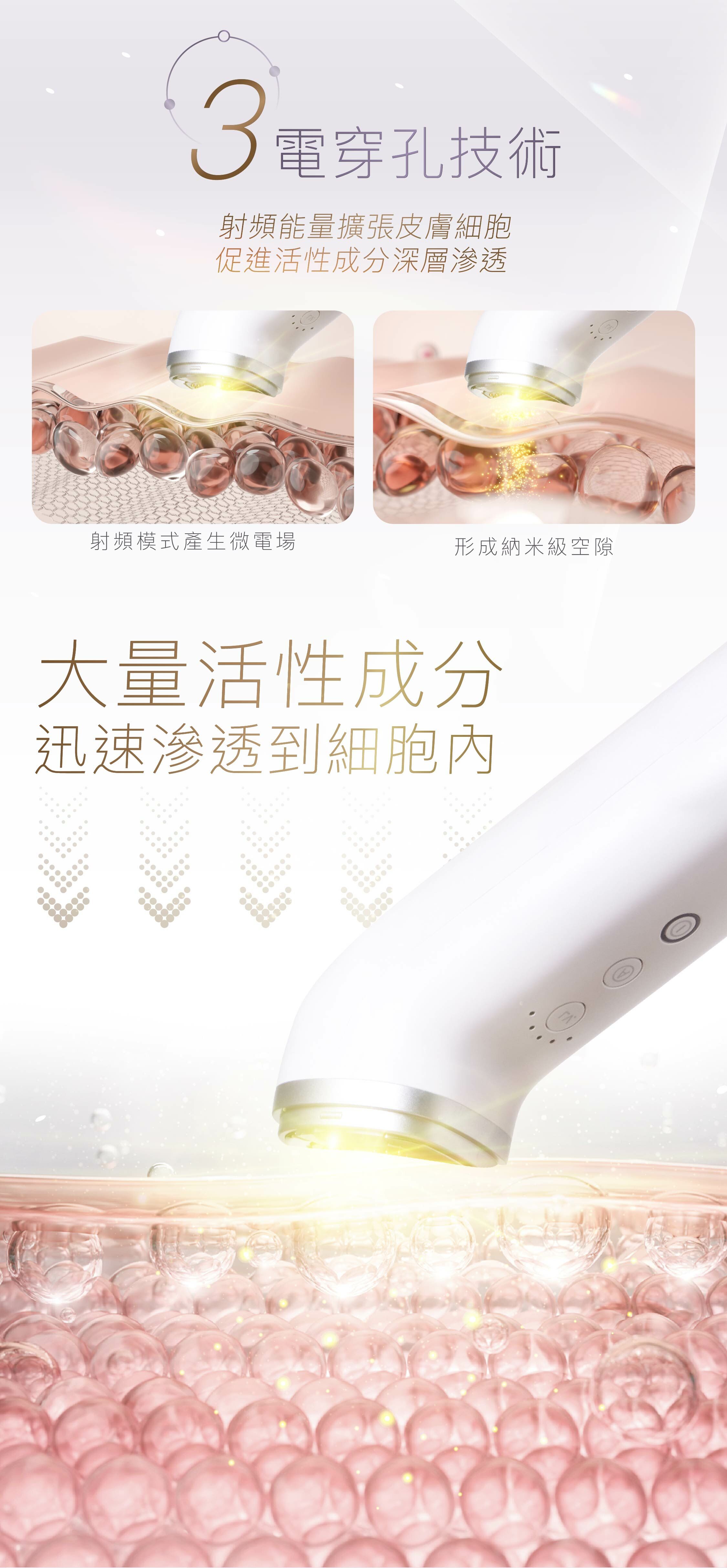 射頻能量令皮膚細胞暫時擴張,形成納米空隙,促使活性成分更易滲透至皮膚底層,提升護膚效果。