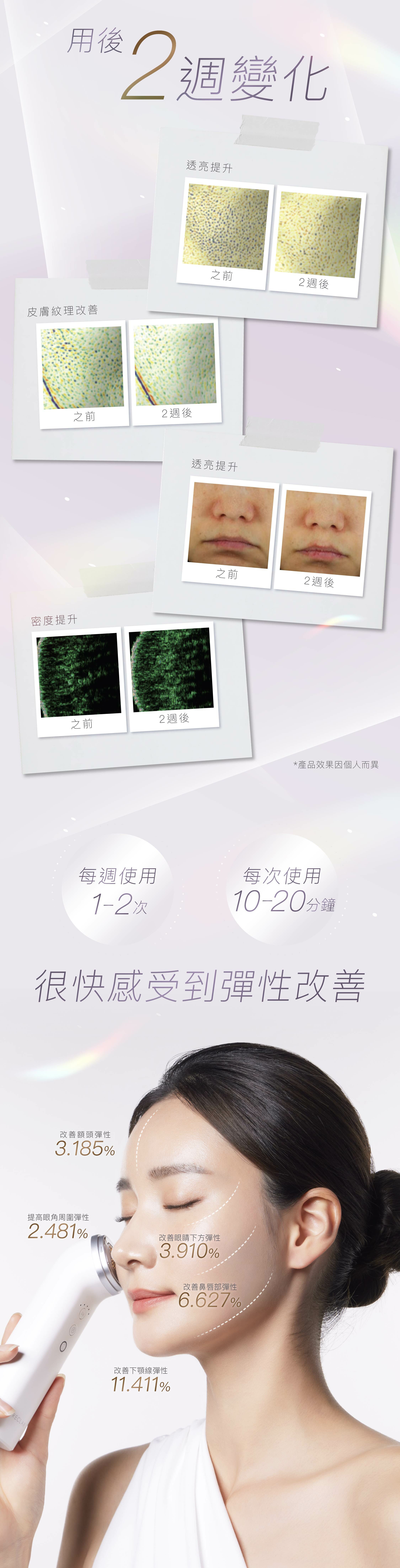 「每次用完立即撫平額頭紋、虎紋,提升蘋果肌,明顯見到皮膚飽滿又firming」