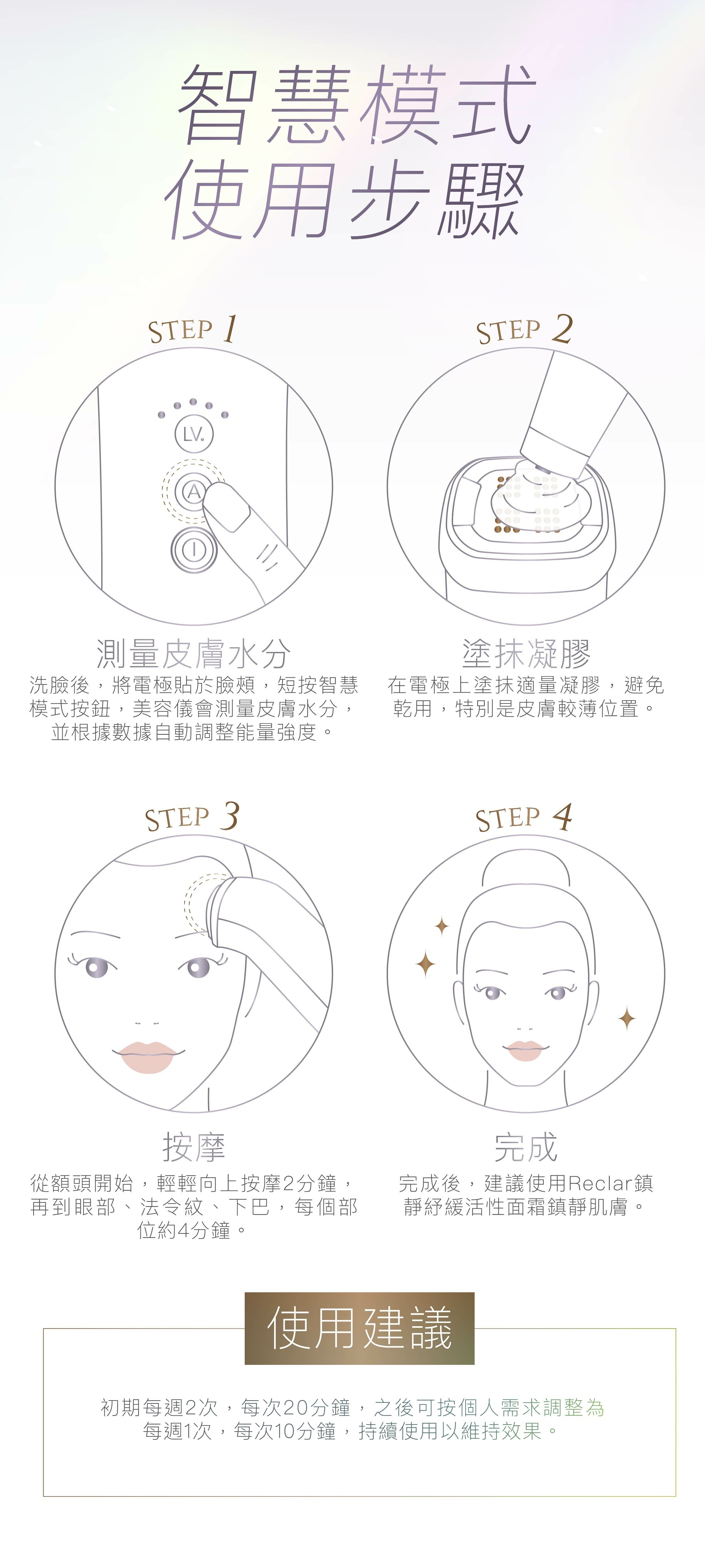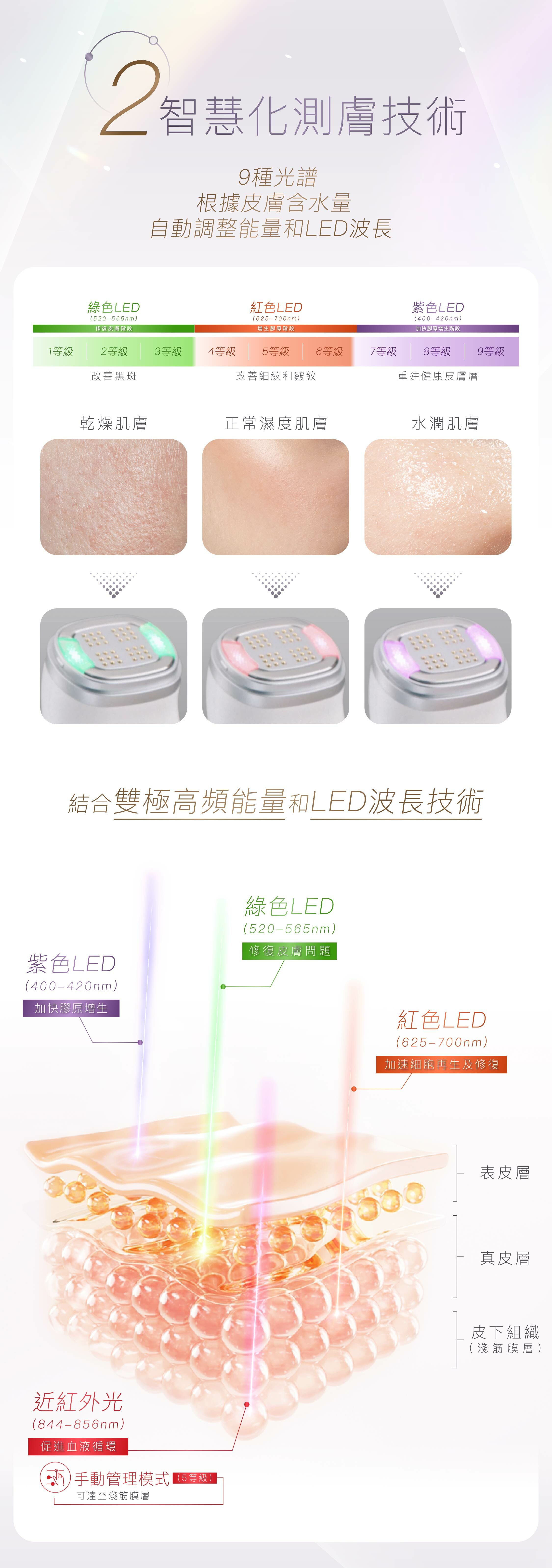 選用智慧模式後,系統會測量並診斷皮膚含水量後,根據預設數據,自動調整能量強度和LED波長,度身定制個人化護膚模式。