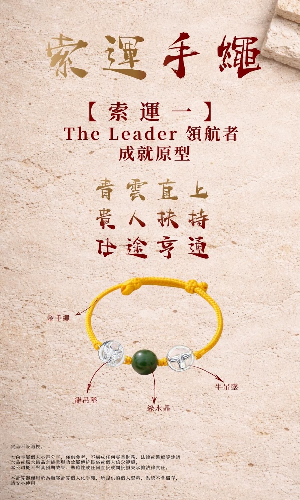 按此 進入命理計算器,發掘專屬你的索運手繩。•七款手繩經精心計算,配搭不同繩結顏色和吊飾,對應不同的流年運勢和節奏。請謹慎選購,貨品不設退換。